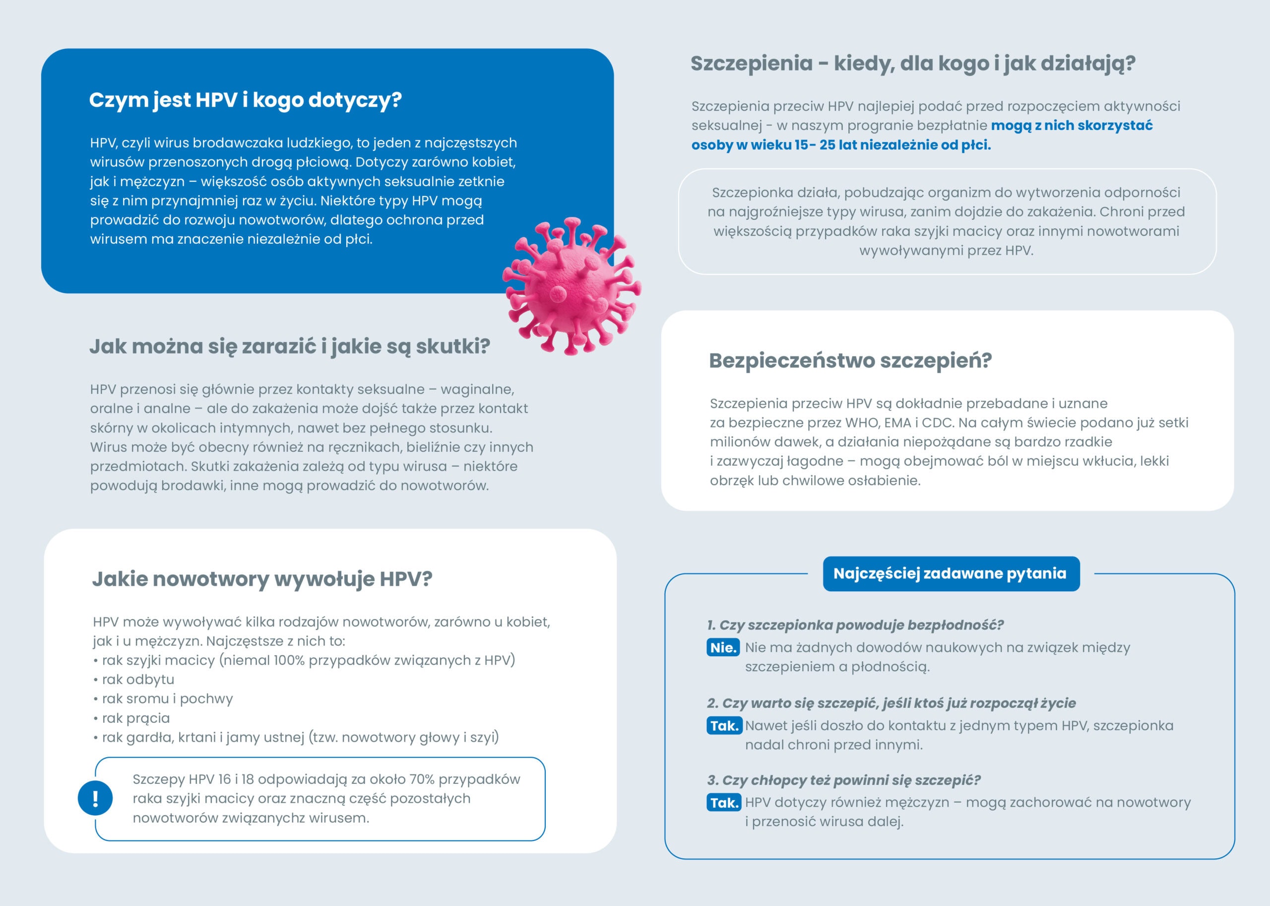 Przypominamy, że każdy mieszkaniec w wieku 15–25 lat (niezależnie od płci) może skorzystać z bezpłatnej szczepionki przeciw wirusowi HPV – najskuteczniejszej ochrony przed rakiem szyjki macicy oraz innymi nowotworami wywoływanymi przez tego wirusa.