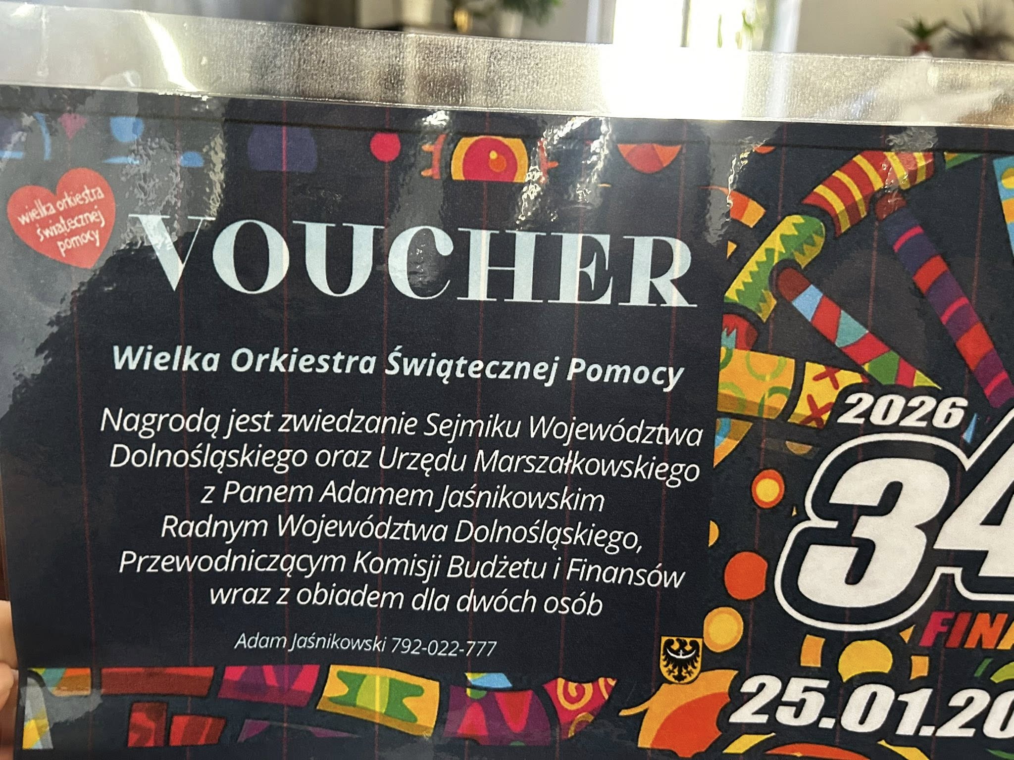 – voucher na zwiedzanie Sejmiku Województwa Dolnośląskiego oraz Urzędu Marszałkowskiego, zakończony obiadem dla dwóch osób w towarzystwie Adama Jaśnikowskiego,