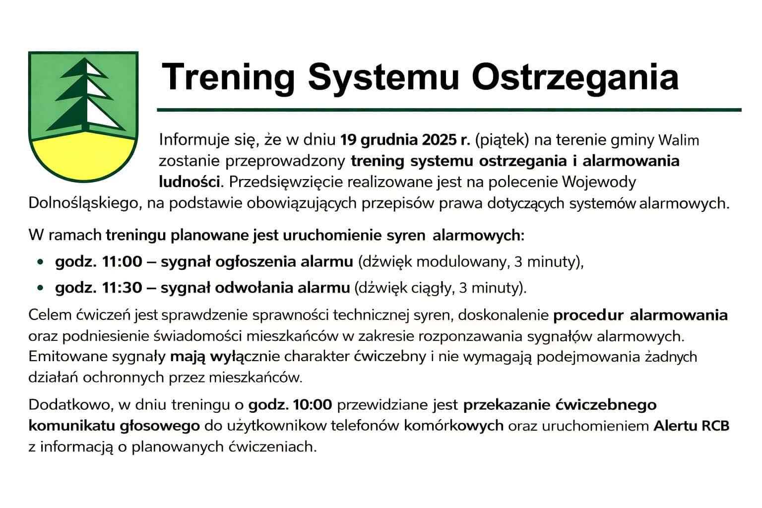 Informuje się, że w dniu 19 grudnia 2025 r. (piątek) na terenie gminy Walim zostanie przeprowadzony trening systemu ostrzegania i alarmowania ludności. Przedsięwzięcie realizowane jest na polecenie Wojewody Dolnośląskiego, na podstawie obowiązujących przepisów prawa dotyczących systemów alarmowych.